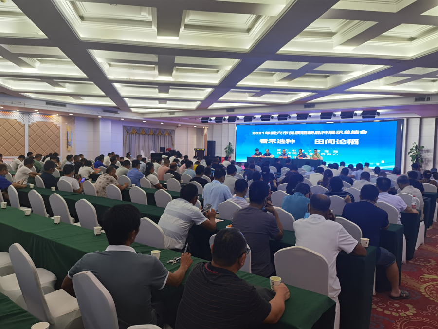 接下來的室內會議,由武穴市農技推廣中心翟主任主持,首先翟主任將本次“看禾選種”的整體情況向與會人員做了介紹,隨后公司總經理助理楊海波將公司近年來的整體情況,以后各類型品種的規劃跟大家做了交流,最后武穴市種子管理局趙局長發言,他對江蘇明天種業以及本次展示的品種給予了充分的肯定,同時也勉勵江蘇明天種業繼續推出更多更優秀的品種造福百姓。